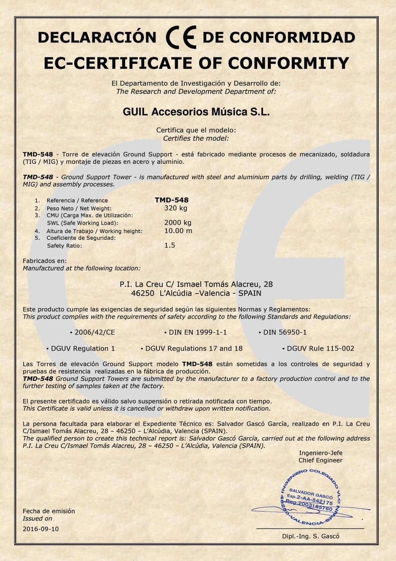 GUIL TMD-548 подъёмная башня (Ground Support), состоящая из пяти секций 4-пунктовой фермы 400х400 (мм), труба Ø 50 толщиной 4 мм, предназначена для использования с электрической лебёдкой (в комплект не входит). Башня оснащена шарнирной системой, позволяющей собирать её в горизонтальном положении и затем поднимать вручную или с использованием системы подъёма BC-TMD и электрической лебёдки. Башня оснащена системой безопасности Zip/Trigger: к фермам мачты приварены металлические пластины, благодаря которым в случае обрыва троса автоматически срабатывает предохранительный крюк, расположенный в каретке, блокируя груз и предотвращая его падение. Трёхсторонняя алюминиевая каретка плавно перемещается вверх и вниз по мачте с помощью шестнадцати усиленных нейлоновых роликов. Алюминиевое основание 726 x 726 (мм) оснащено четырьмя поворотными колёсами Ø 100 мм повышенной прочности. Четыре съёмные выносные опоры с усиленными домкратами обеспечивают идеальную регулировку и устойчивость на любых поверхностях. Башня предназначена для использования с фермами GUIL TS520.